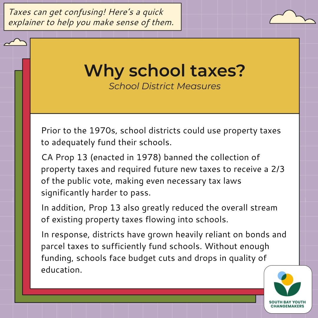 Prior to the 1970s, school districts could use property taxes to adequately fund their schools. CA Prop 13 (enacted in 1978) banned the collection of property taxes and required future new taxes to receive a two-thirds of the public vote, making even necessary tax laws significantly harder to pass. In addition, Prop 13 also greatly reduced the overall stream of existing property taxes flowing into schools. In response, districts have grown heavily reliant on bonds and parcel taxes to sufficiently fund schools. Without enough funding, schools face budget cuts and drops in quality of education.