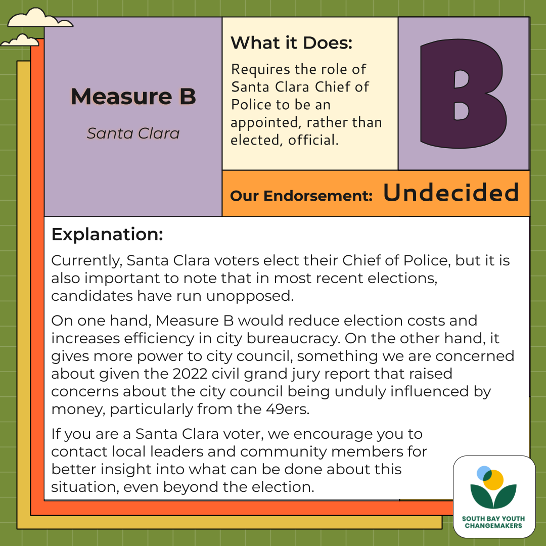 On one hand, Measure B would reduce election costs and increases efficiency in city bureaucracy. On the other hand, it gives more power to city council, something we are concerned about given the 2022 civil grand jury report that raised concerns about the city council being unduly influenced by money, particularly from the 49ers.